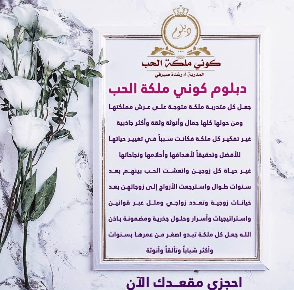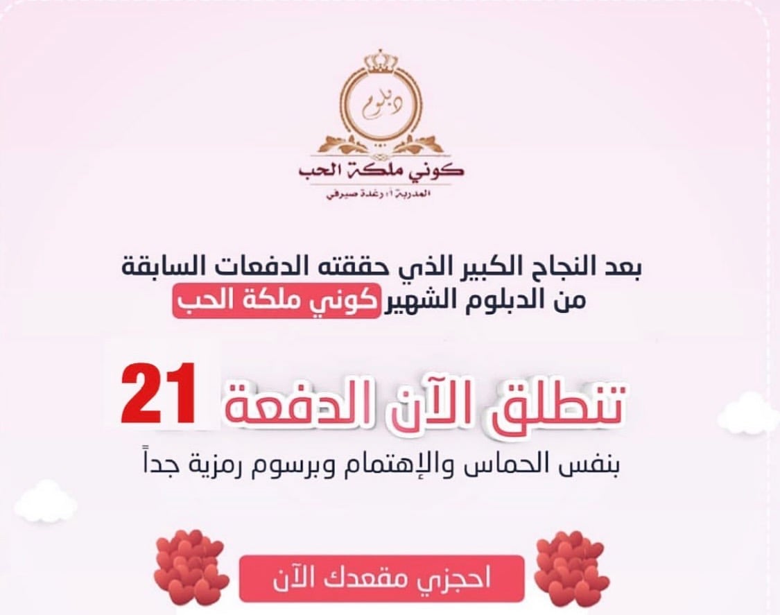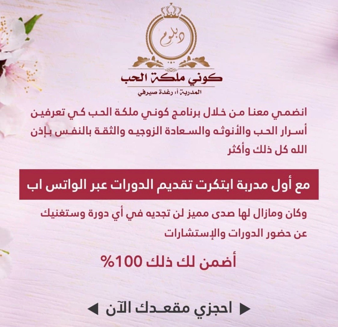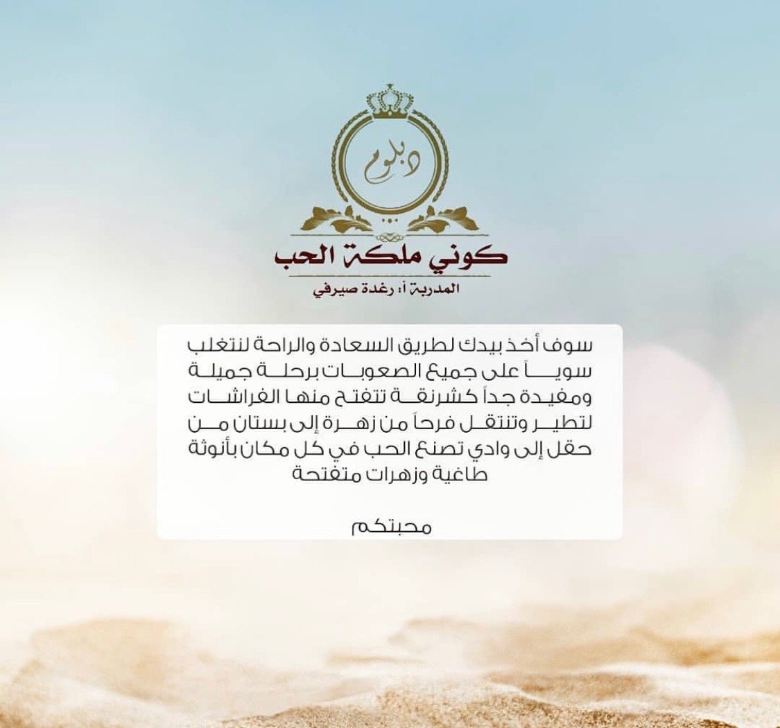 دخلت دبلوم كوني ملكة الحب مرتين .. ومنذ اللحظة التي انضميت فيها تسلل الامل بداخلي كل شيءاصبح ممكن في حياتي .. ما صرت الوم الظروف والماضي.. ضرت فرحانة وعايشة اللحظة تقربت من نفسي وحبيتها ومن الله وصرت احسن خلقا مع الناس بفضل الله حققت جزء من احلامي وصرت واثقة من نفسي جدااا واحب الجميع التمس الاعذار عقلي متسع المدارك الحمدلله رب العالمين ❤❤ احبك رغودة يا من علمتني معنى العطاء ❤