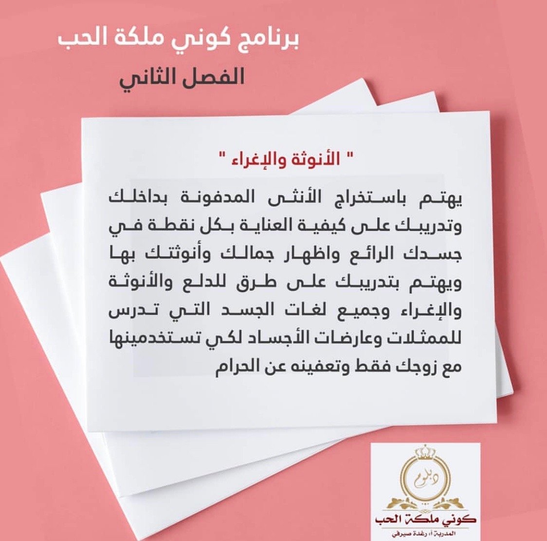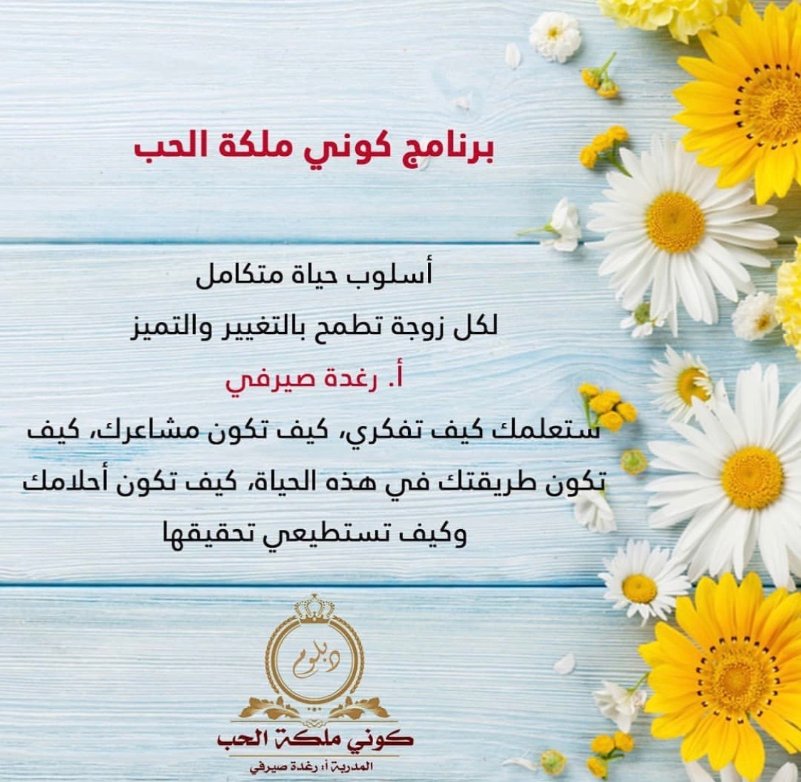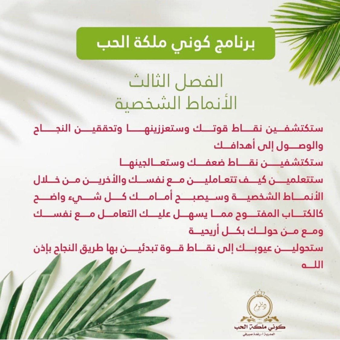 دخلت دبلوم كوني ملكة الحب مرتين .. ومنذ اللحظة التي انضميت فيها تسلل الامل بداخلي كل شيءاصبح ممكن في حياتي .. ما صرت الوم الظروف والماضي.. ضرت فرحانة وعايشة اللحظة تقربت من نفسي وحبيتها ومن الله وصرت احسن خلقا مع الناس بفضل الله حققت جزء من احلامي وصرت واثقة من نفسي جدااا واحب الجميع التمس الاعذار عقلي متسع المدارك الحمدلله رب العالمين ❤❤ احبك رغودة يا من علمتني معنى العطاء ❤