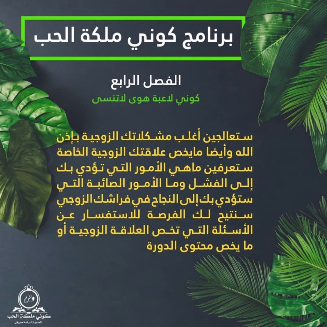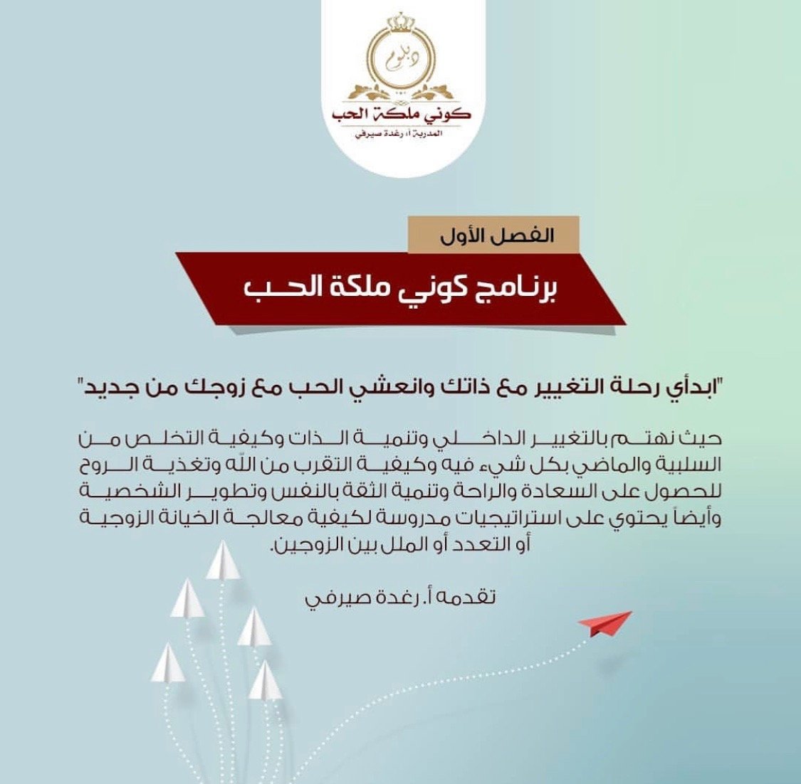 كانت الدورة اجمل دورة دخلتها ملمه بجميع الجوانب الزوجيه وتطوير الذات وكانت قروبات جميله فيها روح التشجيع الجماعي وتتكلم ايضا عن علاقتك مع الله والقرب منه وايضا القصص الرائعه وكان الطرح مشوقا وايضا كيفيه بناء الاسره وكانت الاستاذه رغده بمثابه الاخت الصادقه الوفيه والمشرفات اللاتي شجعوني اشكر الاستاذه رغد الصيرفي على كل ما قامت به من جهود